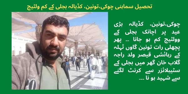 چوکی،تونین، کڈیالہ بڑی عید پر اچانک بجلی کے وولٹیج کم ہو جانا ۔۔ پھر پچھلی رات تونین گاوں ٹہلہ کے رہائشی قیصر ولد راجہ گلاب خان گھر میں بجلی کے سٹیبلائزر سے کرنٹ لگنے سے شہید ہو نا ۔۔۔ بہت ہی تکلیف دہ سانحہ ہے۔عید پر اچانک بجلی کے وولٹیج کم ہو جانا عوام پر بہت ظلم ہے. اللہ پاک قیصر بھائی کو جنت الفردوس میں اعلی مقام عطا فرمائے اور لواحقین کو صبر جمیل عطا فرمائے آمین ثم آمین